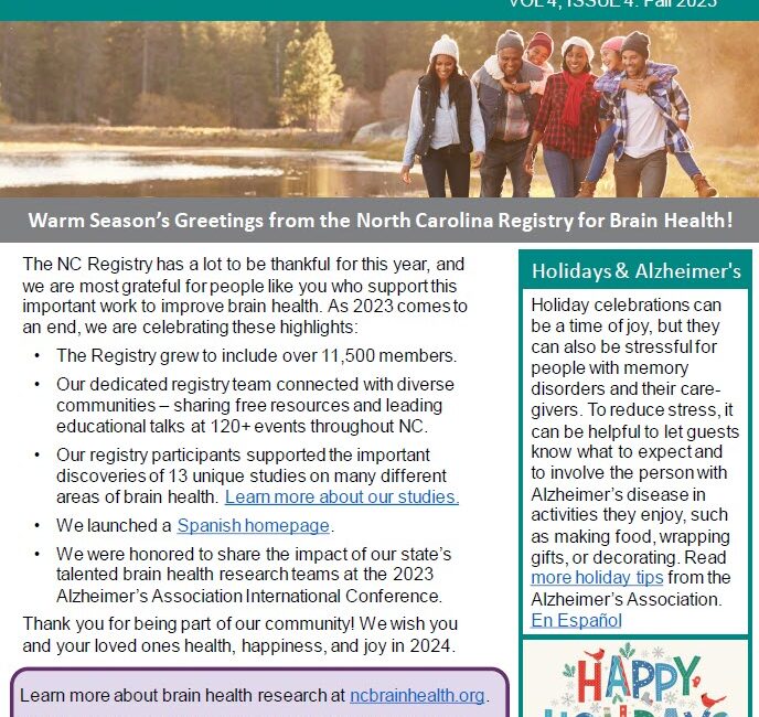 The NC Registry has a lot to be thankful for this year! Read the Fall 2023 Newsletter to learn about the highlights we’re celebrating. This newsletter also includes information on a variety of topics to support people with memory disorders and their caregivers, including: