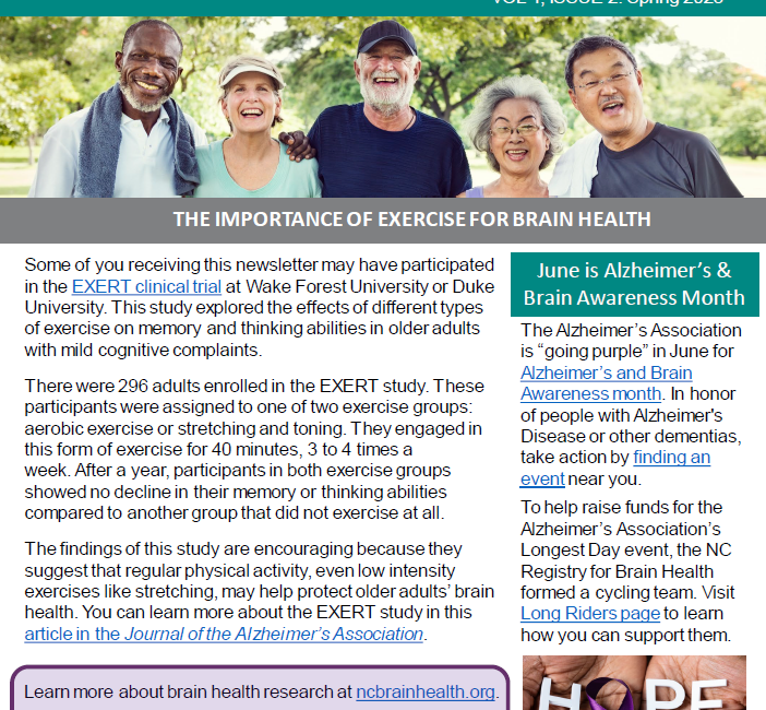 Read the Spring 2023 Newsletter to learn about the importance of exercise for brain health. You will also find information about ways to safely add physical activity to your daily routine, resources for caregivers, and information about Alzheimer’s therapies of the future. Learn more by clicking the link below.