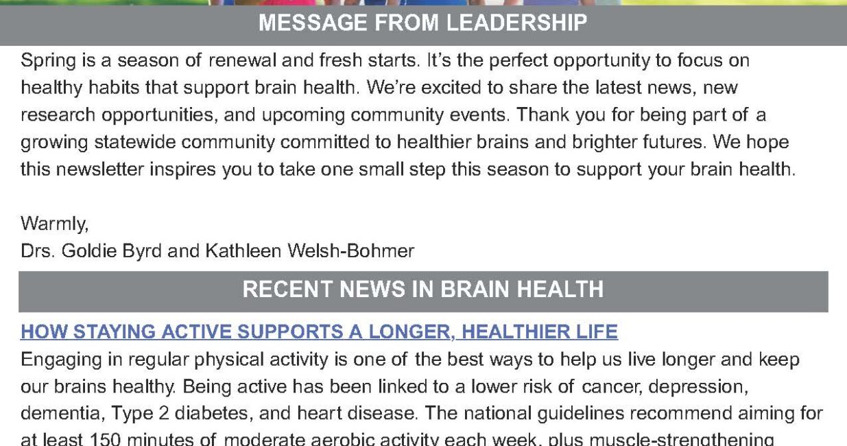 Learn how to support your brain in the spring edition of the NC Brain Health newsletter. This issue highlights helpful brain health tips, research opportunities, and upcoming community events happening across North Carolina.